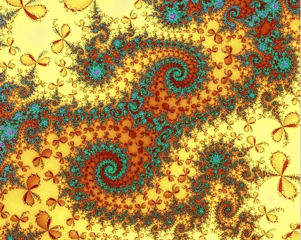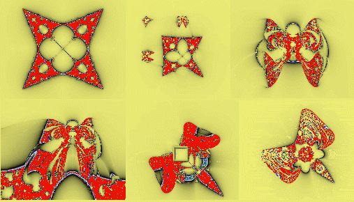 ), oder die vom Apfelmännchen bekannten Doppelspiralen, hier im Flügelmuster,