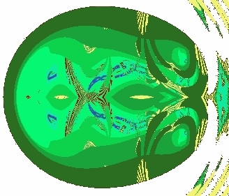 Im großen Schädel links entstehen schnell sehr große negative Zahlen, die durch die Verkopplung entweder etwas schneller (blau) oder etwas langsamer (rot) divergieren. Etwa bei Zx=1/A wird das Cx=-1 kompensiert oder verdoppelt, was bereits klare Unterschiede im Divergenzverhalten bringt, die sich hier als Schädelmuster darstellen. Das additive Cx der Größe Minus Eins ist hier die entscheidende symmetriebrechende Einheit. Setzt man es ganz Null, werden beide 'Hirne' leer und strukturlos. Mehr